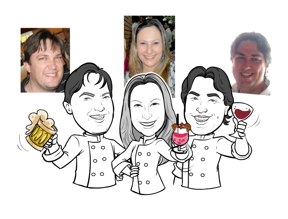 Ela encomendou a caricatura dos três – cada um com uma bebida diferente para representar a versatilidade do negócio – e compôs o logo da empresa.